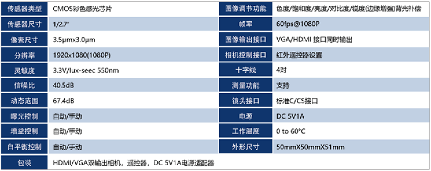 显微镜HDMI+VGA双输出相机VIS300V一般应用于工业现场,集图像采集、处理、显示于一体,采用高质量的传感器芯片,图像清晰度高、色彩艳丽、边沿轮廓分明、智能化程度高,搭建系统成本低,直接接VGA或HDMI接口显示设备,不需要通过连接电脑来显示,提高了显示速度,可连接显微镜进行图像观察,可广泛应用于工业检测,医l等应用领域。