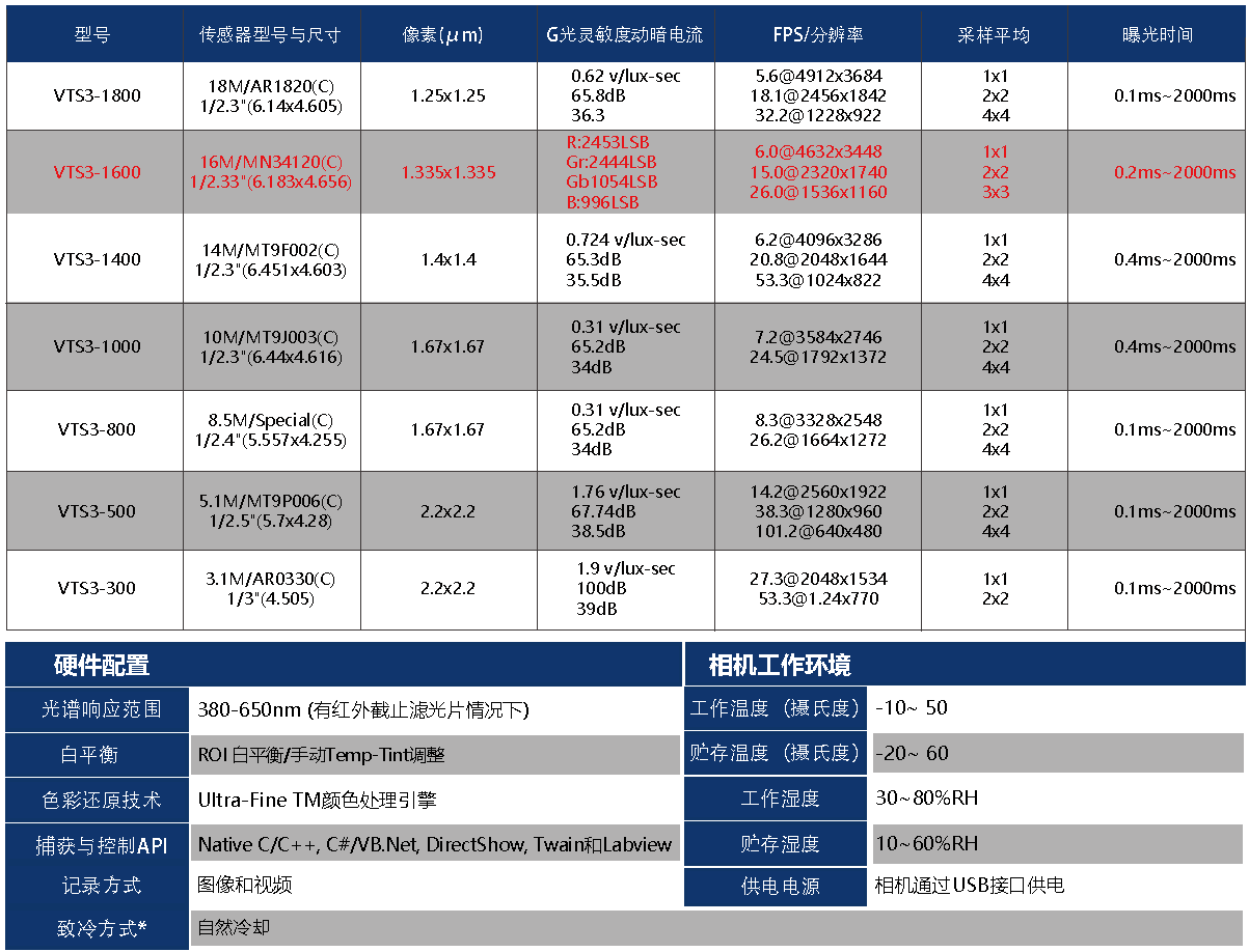 显微镜USB3.0CMOS硬件ISP相机VTSE3S集成了12位的超精细硬件图像信号处理器视频流引擎((Ultra-fine™HISPVP),通过该HISPVP实现硬件Demosaic,调整,自动曝光,增益调节,一键单击白平衡,影像色品调整,饱和度调整,伽马校正,亮度调节,对比度调整,Bayer格式图像转RAW数据供终以8/12bit输出。HISPVP将传统的本应由计算机CPU处理的转移到了硬件处理,大大提升了相机的传输速度,降低了CPU的占用率。