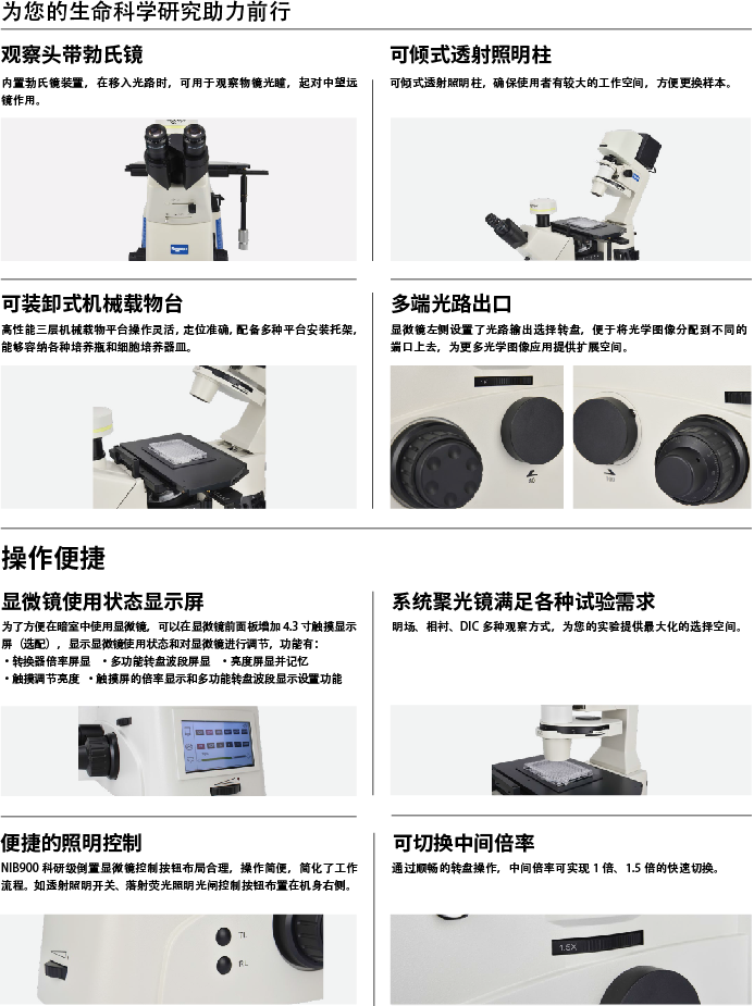 倒置研究级生物显微镜NIB900操作简单、功能强大、搭配灵活、性价比高。此系列有两种机型可供选择,满足您的不同需求:明场相衬机型NIB900和反射荧光机型NIB900-FL。明场相衬机型采用高亮度卤素灯照明(可选用LED照明),确保整个视场内亮度均一,成像质量尤秀。反射荧光机型采用高压汞灯照明(可选配长工作时间的金属卤化物照明),波段宽,亮度大,确保每个激发波段都能得到高亮度的显微成像。