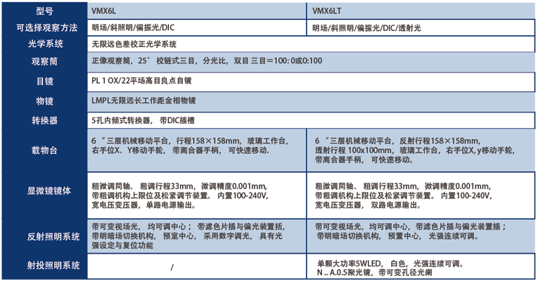 2、VMX4L/VMX4LT:4英寸双层机械移动平台,移动范围105mm×105mm;VMX6L/VMX6LT:6英寸三层机械移动平台,反射照明移动范围158mm×158
