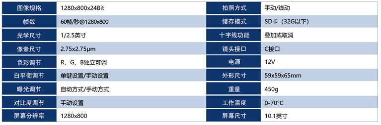 全数字HDMI输出显示,无须与PC连接,可直接连接液晶显示器,观看视频图像,可直接拍照SD存储保存参数功能,可实时保存调整后的各种参数。
