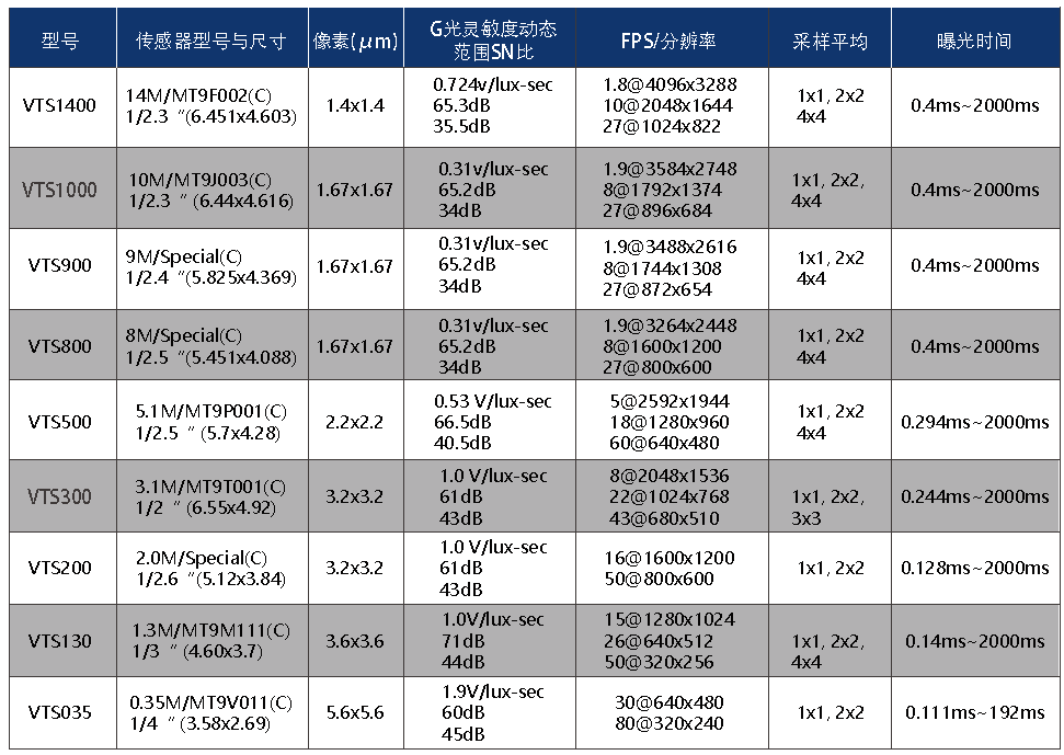 VTS系列相机是一款高性能USB2.0与CMOS图像传感器相机(ultra-high performance USB2.0CMOS相机),采用USB2.0作为数据传输接口;VTS相机采用Aptina