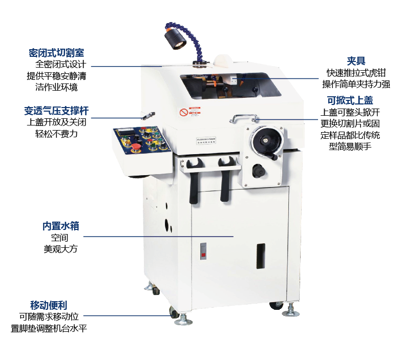 1.小型落地式金相切割机VISCUT 60A自动进退刀, 到达设定位置后自动退刀 ,进刀速度可调整;
