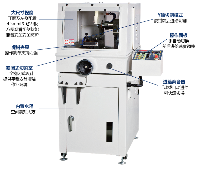 1.水平进刀方式大型金相切割机, 手动自动一体机。主轴采用高精度组合斜角滚珠轴承,径向及轴向皆能负荷且高转速下经久耐用。