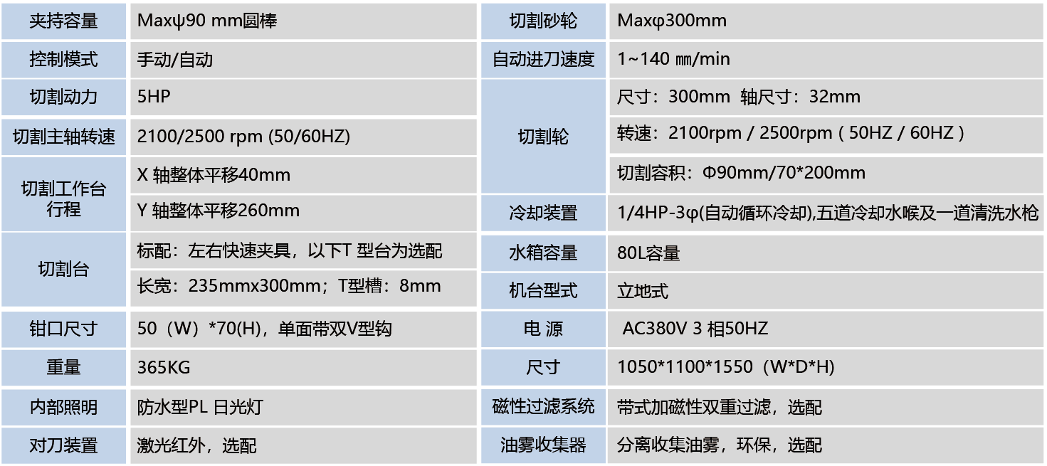 1.切割动力:主轴马达采用5HP小型齿轮马达带动工作台前进水平进刀方式进刀,