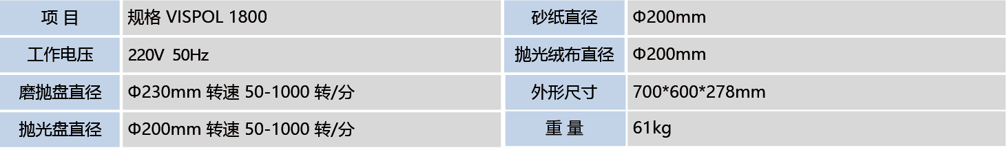 1.VISPOL 1800无级调速式试验磨抛机为双盘双控台式机,适用于对金相试样进行预磨、研磨和抛光操作。本机通过变频器调速,可直接获得 50-1000 转/分钟之间的转速,从而使本机具更广泛的应用性,是用户用来制作金相试样必不可缺少的设备。